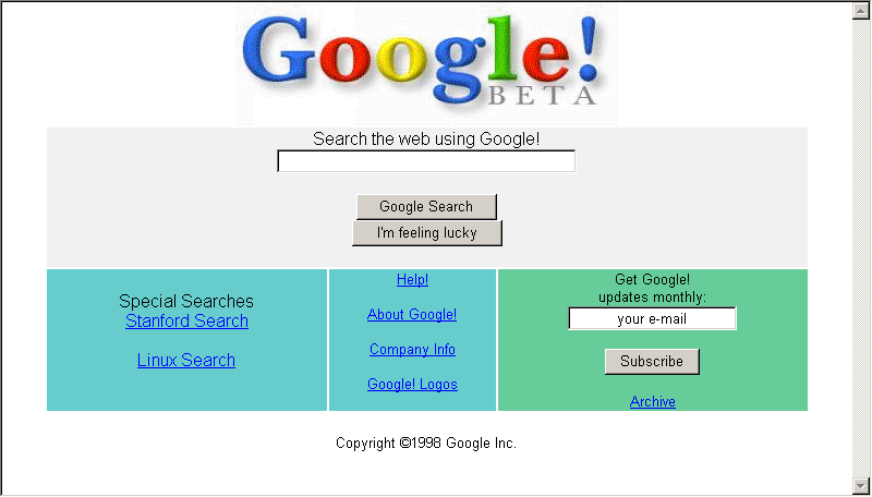 En enero de 1996, dos estudiantes de la Universidad de Stanford, Larry Page y Sergey Brin, empezaron un proyecto de motor de búsqueda llamado BackRub. Un año después deciden cambiar el nombre por Google, que deriva del número googol (10100, el 1 seguido de 100 ceros), aludiendo a la inmensa cantidad de información que hay en Internet. El 4 de septiembre de 1998 fundaron Google Inc., y el 27 del mismo mes lanzaron su motor de búsqueda, que se convirtió en todo un éxito y fue el comienzo de un imperio que domina la Red hoy en día.