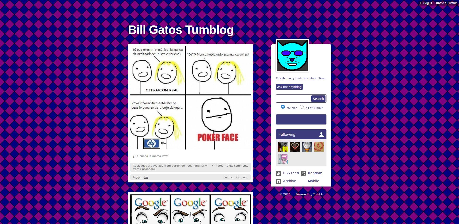 Descubrí Tumblr a finales de 2010, y en marzo del año siguiente empecé a publicar cosas en mi tumblog. Al principio era una alternativa “menos seria” al blog que tenía en WordPress.com, pero, con el tiempo, fui dejando de lado mi blog principal y me centré más en Tumblr. En noviembre de 2011 dejé de publicar definitivamente en Wordpress.com, mientras poco a poco iba moviendo contenidos, serios o no, de un blog a otro.
