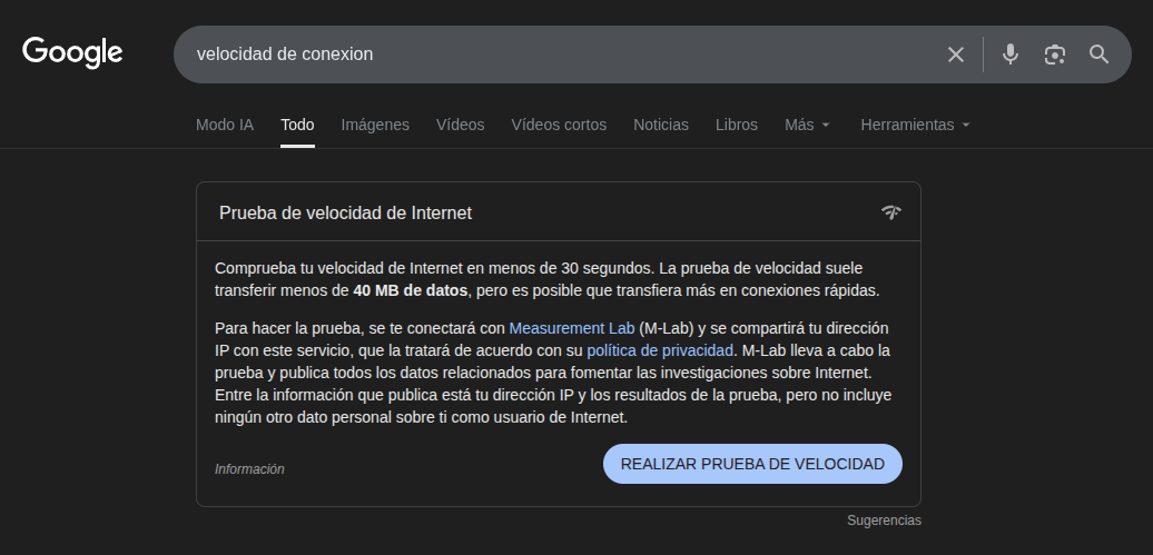 ¿Te gustaría saber la velocidad real de tu conexión? Escribe “velocidad de conexión” o “test de velocidad” en Google y podrás hacerlo desde la misma página de resultados.